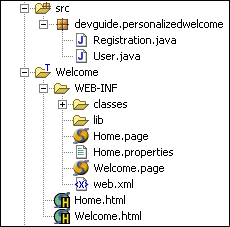 The layout of the application here is same as the one we used for the static welcome application except that here we have a second template and specification in addition to a couple of JavaBeans classes and a localized properties file (Home.properties).